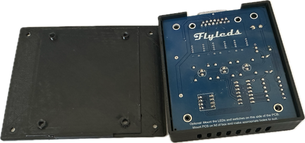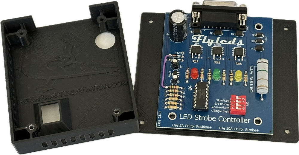 This is a design to hold the LED Strobe Controller circuit board from Flyleds. This will work with the latest version of "The Essentials" kit. There are other version available but are a little bit tricky to print. This is a simple easy to print box with ventilation that allows access to the toggle switches for changing the strobe pattern. The top and bottom can be secured with four #6 5/8 or 3/4" countersunk wood screws. The entire box has clearance holes for a #6 machine screw for mounting in your aircraft (or use industrial strength double sided tape) Download the files and print yourself for free or buy a version printed in ABS with hardware included from Mountain Ride Aviation.